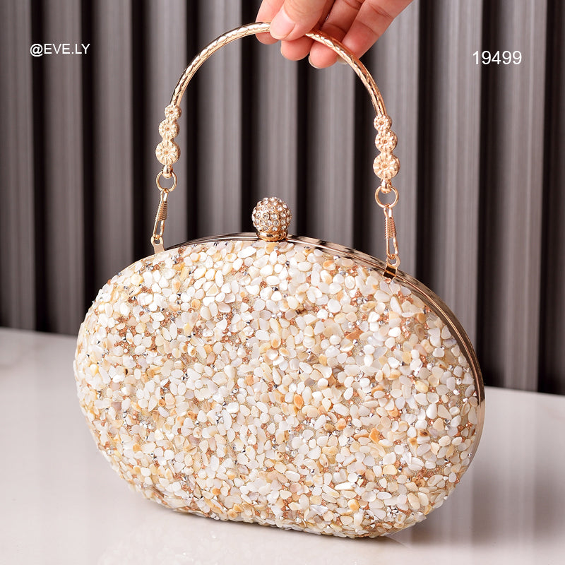 حقيبة "إيڤال" هي القطعة التي ستحول إطلالتك البسيطة إلى إطلالة ملكية. بفضل بريقها الكثيف وتصميمها البيضاوي الفريد، تعتبر الخيار الأول لحفلات الزفاف والمناسبات الرسمية الكبرى، وتوفر لكِ مظهراً فخماً جداً .