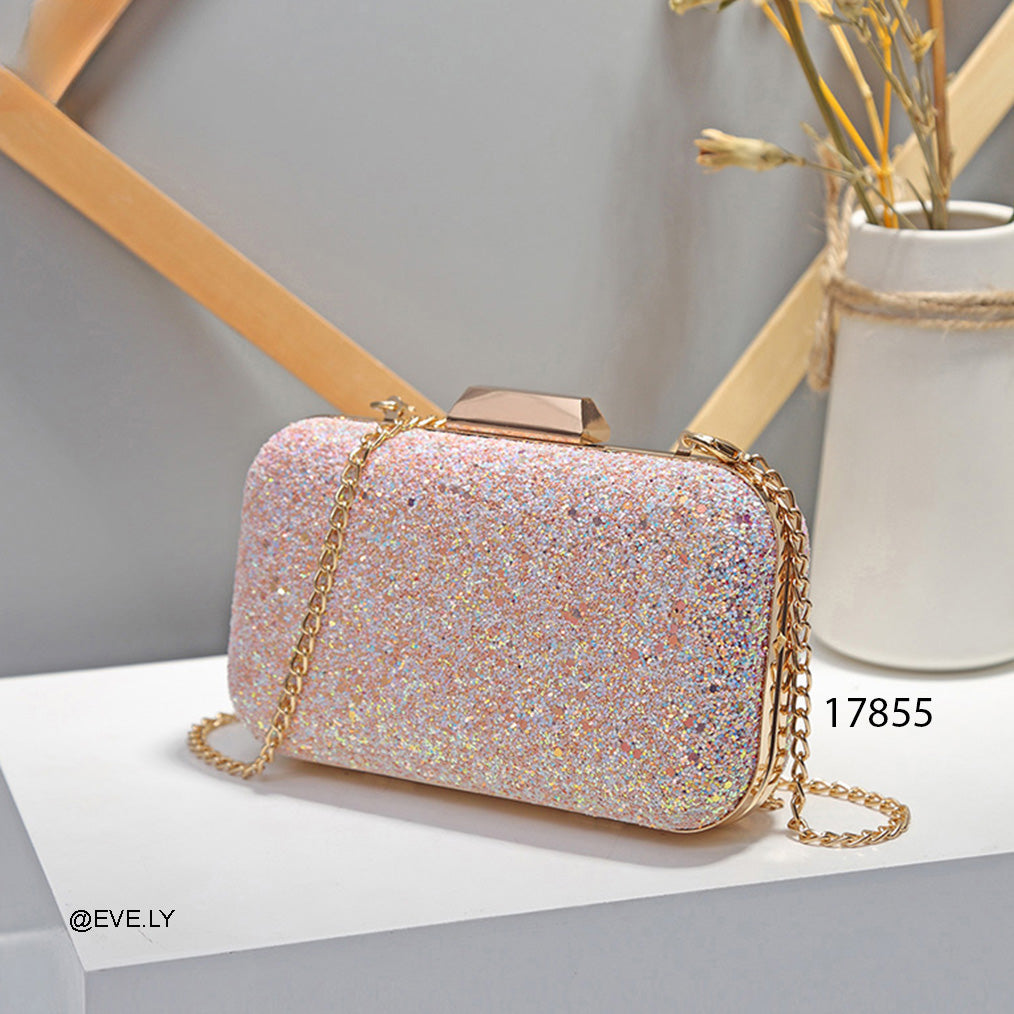 الوصف: حقيبة سهرة صغيرة (Clutch) بتصميم صندوقي أنيق، مغطاة بالكامل بطبقة من "الجليتر" الملون الذي يعكس الضوء ليمنحكِ حضوراً لافتاً في المناسبات. تتميز بإطار معدني ذهبي وقفل علوي سهل الاستخدام، مما يجعلها قطعة إكسسوار مثالية تكمل إطلالتكِ المسائية بكل بساطة.