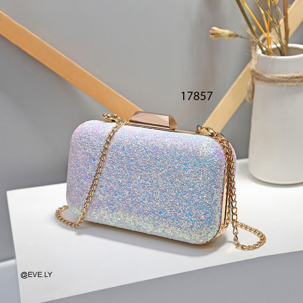 الوصف: حقيبة سهرة صغيرة (Clutch) بتصميم صندوقي أنيق، مغطاة بالكامل بطبقة من "الجليتر" الملون الذي يعكس الضوء ليمنحكِ حضوراً لافتاً في المناسبات. تتميز بإطار معدني ذهبي وقفل علوي سهل الاستخدام، مما يجعلها قطعة إكسسوار مثالية تكمل إطلالتكِ المسائية بكل بساطة.