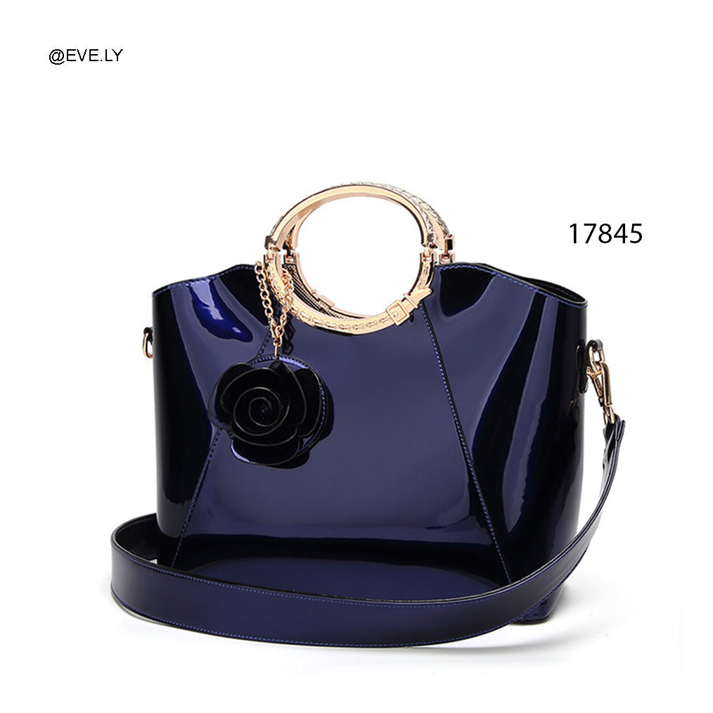 الوصف: حقيبة يد كتف عملية تتميز بمظهرها اللامع وتصميمها الهندسي الذي يمنحكِ إطلالة متجددة. تأتي بمقبض يد دائري يسهل حملها، مع إكسسوار جانبي لطيف على شكل وردة، مما يجعلها خياراً اقتصادياً وأنيقاً لمشاويرك اليومية أو المناسبات البسيطة.
